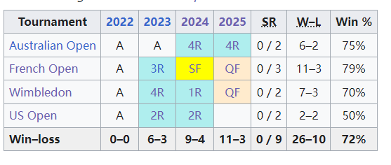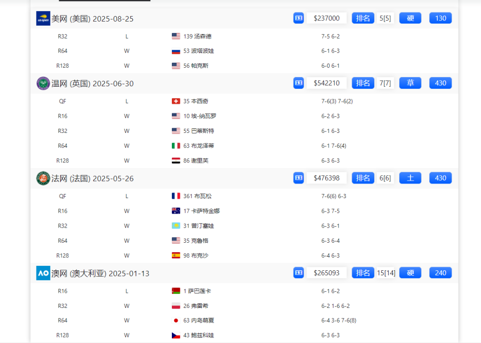 三次参加美网:2023第二轮、2024第二轮、2025第三轮