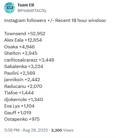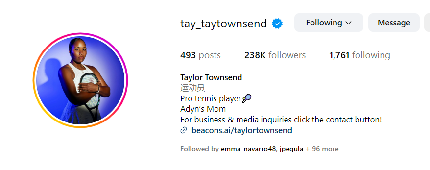 过去几天汤森德的INS涨粉10万。她18小时内涨粉5万多,排在她后面的是伊埃拉、大坂直美、汤森德、阿尔卡拉斯、萨巴伦卡、泡里尼、辛纳和拉杜卡努。